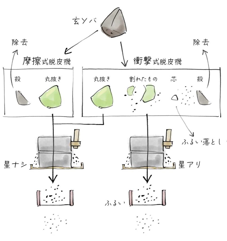 ふるいには、大まかに割れた中〜外層と殻の破片が残るため、蕎麦にすると淡い生地に破片による「黒い星」が入るのが特徴です。また、衝撃によって柔らかい芯が細かく砕けてふるいから落ちやすくなるため、デンプンの割合が丸抜きより少なくなります。